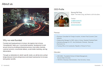 Founded and headquartered in Incheon, the logistics hub in Korea, “KoreaAsia.biz” helps your “cross-border business” development in and around Korea by providing professional services: local online channels, customer services, cross-border delivery, social media marketing, and big data analysis.